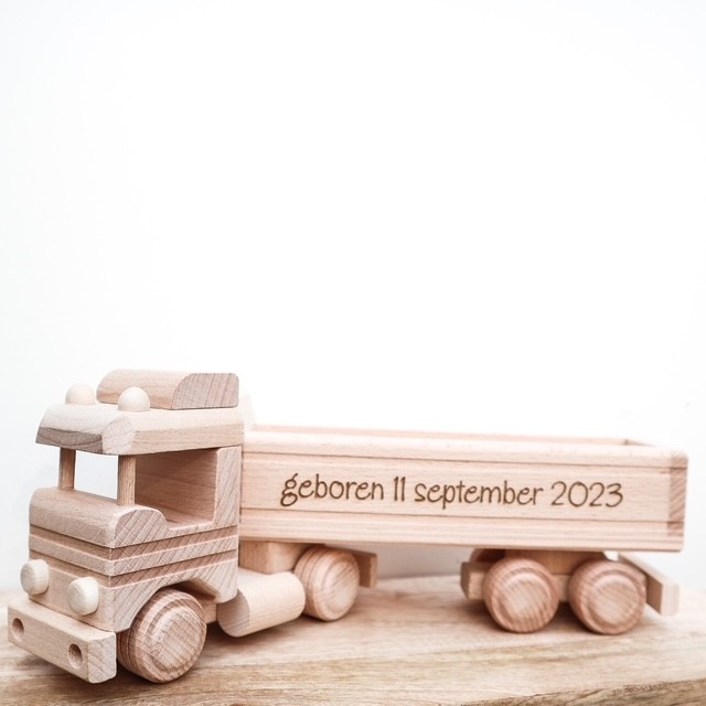 Wil je een houten vrachtwagen laten personaliseren met naam of eigen tekst? Dit unieke cadeau is perfect als duurzaam, creatief en persoonlijk speelgoed voor kinderen.
