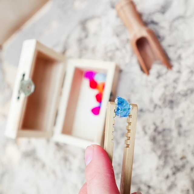 Ga op schattenjacht met deze sensorische speelset schatkist graven. In deze spannende speelset kunnen kinderen de 12 kleurrijke diamantjes verstoppen in sensorisch zand of gekleurd rijst en vervolgens weer zoeken en opgraven.