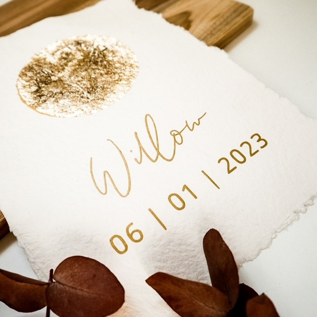 Maanstand poster A4 met naam en datumMaanstandposter van handgeschept papier en bladgoud. Handgemaakt en gepersonaliseerd met naam en datum.